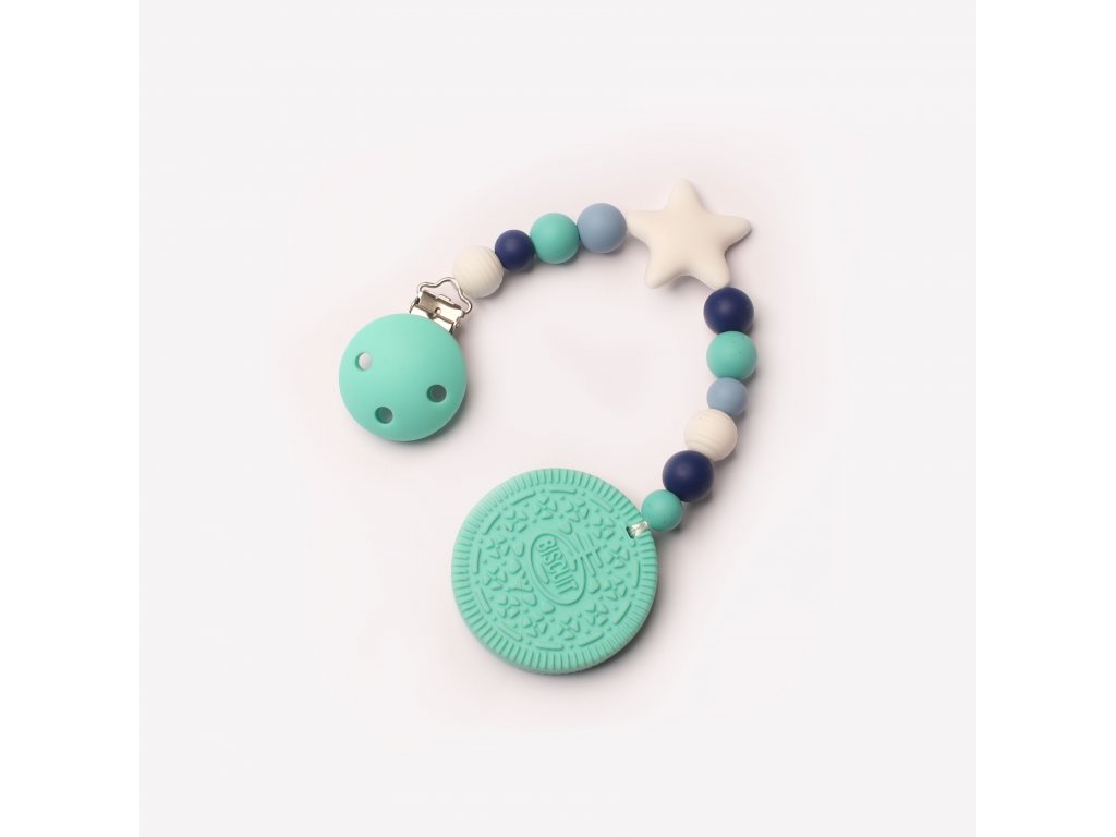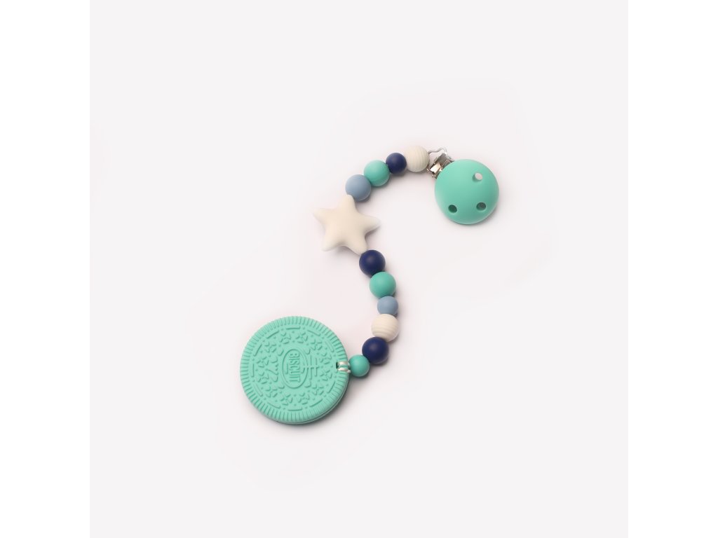 Průzračný jako čisté moře, svěží jako jarní vánek - takové je toto vyladěné kousátko na klipu! Silikonové kousátko na klip ve stylové kombinaci tmavě tyrkysových, modrých a bílých korálek.